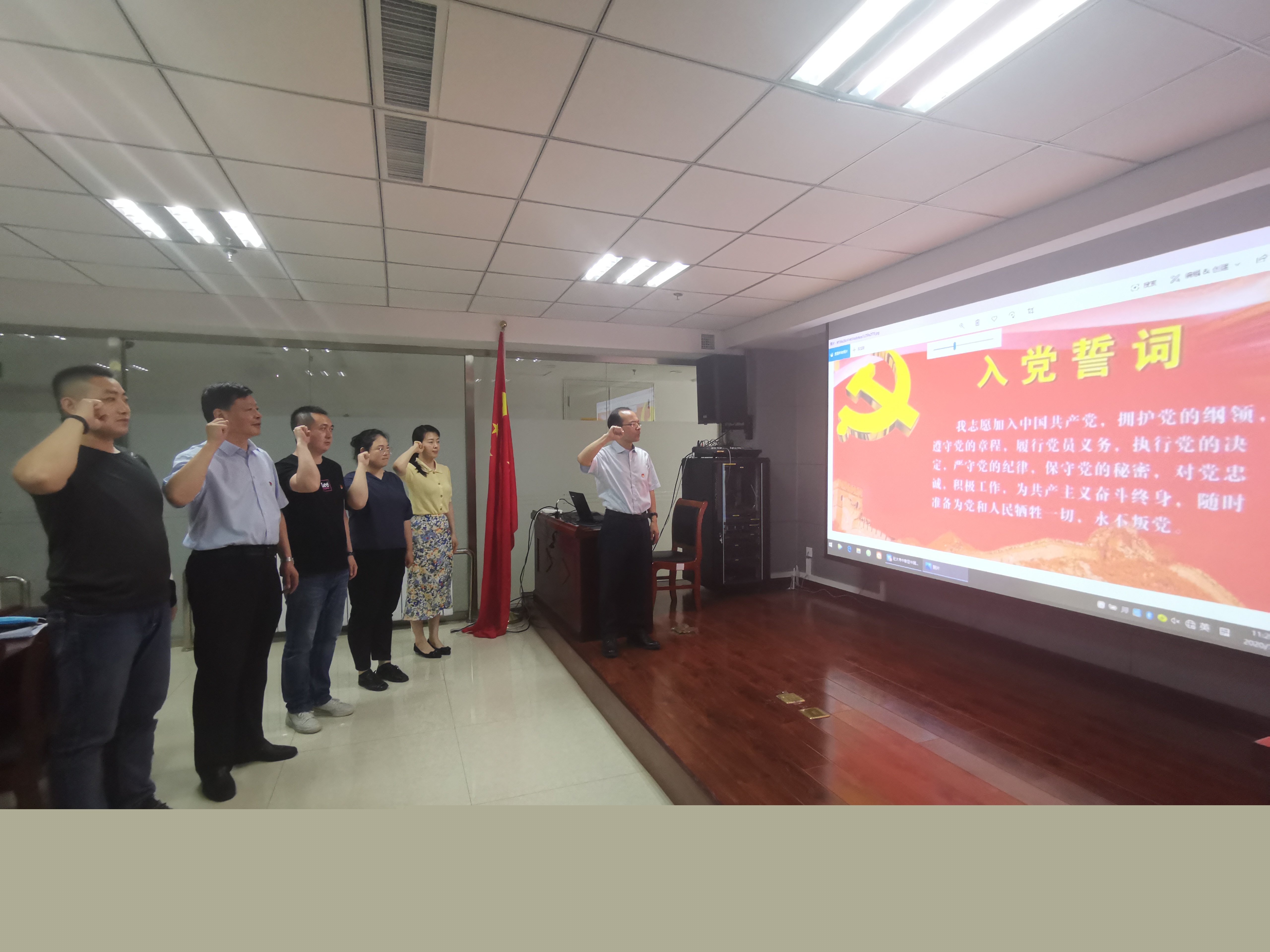 由黨支部書記焦俊良同志領(lǐng)誓,全體黨員面對(duì)鮮紅的黨旗,舉起右拳,莊嚴(yán)宣誓?!拔倚模何抑驹讣尤胫袊?guó)共產(chǎn)黨,擁護(hù)黨的綱領(lǐng),遵守黨的章程,履行黨員義務(wù),執(zhí)行黨的決定,嚴(yán)守黨的紀(jì)律,保守黨的秘密,對(duì)黨忠誠(chéng),積極工作,為共產(chǎn)主義奮斗終身,隨時(shí)準(zhǔn)備為黨和人民犧牲一切,永不叛黨。”鏗鏘有力的誓言,讓每名黨員受到了一次深刻的黨性教育和政治靈魂洗禮。